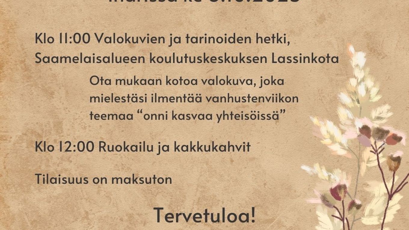 Julkaistu 29.9.2025 Muokattu 29.9.2025Tervetuloa viettämään Vanhustenviikon yhteisöllistä tapahtumaan Saamelaisalueen koulutuskeskukseen 8.10. klo 11.00.